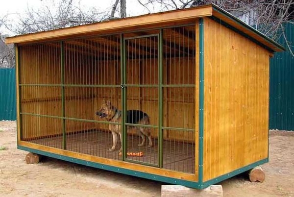 Если содержать в вольере собаку собираются лишь на непродолжительный промежуток времени — приход соседей, бригады строителей и т.д. — делают только загон с крышей. Если же животное планируется оставлять за оградой длительное время, нужна еще и будка. Ее можно поставить внутрь или пристроить.