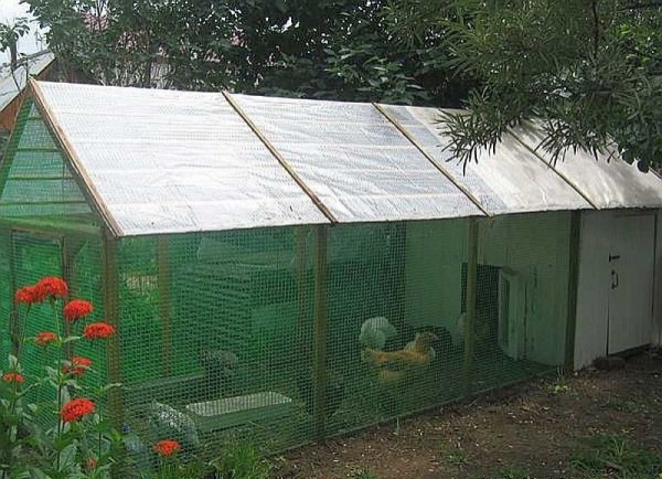 Такой курятник удобен на даче, на частном подворье, строится легко и быстро. Делают общий деревянный каркас, поделенный на две неравные части. Большая — загон — зашивается сеткой, вторая — меньшая — отводится собственно под курятник и обшивается каким-либо материалом снаружи, оборудуется внутри насестами. Методика строительства такая же, как и каркасного деревянного сарая.