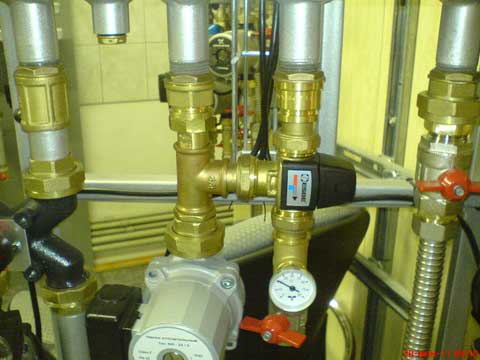 Это – наиболее востребованный тип подобного устройства. Он работает по следующему принципу – клапан периодически подпитывает магистраль с горячим теплоносителем из отопительной системы. Как правило, на корпусе устройства бывает указано значение требуемого нагрева. Его можно изменять, используя встроенный или дистанционный датчик. Последний монтируют во входной гребенке.