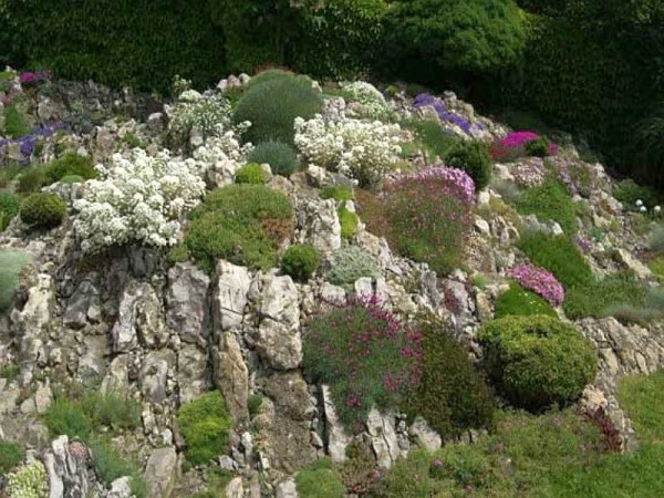К высадке кустарников и деревьев нужно подходить очень осторожно: они вырастают, все-таки приличными по высоте, попытки их обрезать только вредят внешнему виду. Если хотите, ищите карликовые разновидности, но уточняйте их рост. Можно порекомендовать горизонтальные можевельники — они разрастаются в стороны, а вверх почти не растут. Можно использовать горную сосну или гнездовую ель. Но это — при достаточной высоте рельефа. Деревья и кустарники садят в любом случае в «низине», причем так, чтобы оно не перекрыло обзор.