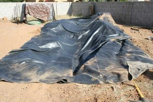 Далее в котлован расстилают пленку. Под нее желательно расстелить геотекстиль (самый дешевый — 600-700 рублей рулон). Этот нетканый материал предотвратит прорастание корней, а также более равномерно перераспределит нагрузку. Его укладывают и на края котлована, застилают бока и дно. Сверху уже — пленку.