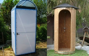 Самые простые уличные душевые кабины для дачи могут быть установлены в самые короткие сроки и представляют собой «походный вариант»: на вкопанный в землю каркас из дерева или металла натягивается брезент или клеенка, образующие стенки, а в верхней части устанавливается пластиковый душ с лейкой. Вода нагревается естественным способом, а стоки отводятся в лучшем случае по вырытой канаве. Возможности такого сооружения сильно ограничены, к тому же оно не отличается долговечностью. К преимуществам таких душевых кабин можно отнести лишь простоту монтажа и минимальные затраты.