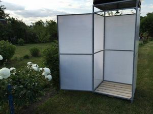 - Душ для дачи из поликарбоната с раздевалкой намного удобнее, чем более простая конструкция. Снятая грязная и приготовленная чистая одежда, а также полотенца останутся сухими. Процесс переодевания будет комфортным.