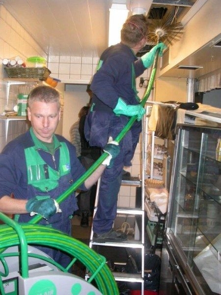 В другой вход запускается чистящая машина. Она взрыхляет и отрывает пыль и жир от стен трубы одним из вышеперечисленных способов. Освобожденная грязь всасывается в отверстие с подсоединенным шлангом.