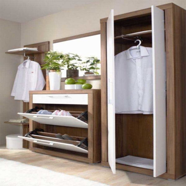 Если еще есть свободное место, поставьте обувницу. Она может быть в виде узкого комода с откидными ящиками или в виде тумбочки с наклонными проволочными полками. И тот, и другой вариант неплохи. Эту компоновку уже вряд ли можно назвать компактные прихожие в коридор, но это и не супер большой гарнитур.
