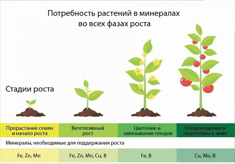 Если удобрения будут с недостаточно высоким содержанием этих действующих компонентов на начальных этапах после посадки, это может привести к серьезному уменьшению урожайности культуры, так как процессы биохимического типа будут подавлены и гораздо меньше, чем нужно для нормального функционирования и роста культур. Очень важны для хорошего полноценного развития железо, марганец, бор и цинк. Железо обеспечивает усиление процесса окисления, поэтому если его острая нехватка, может возникнуть сложность с развитием тяжелых болезней на растениях.