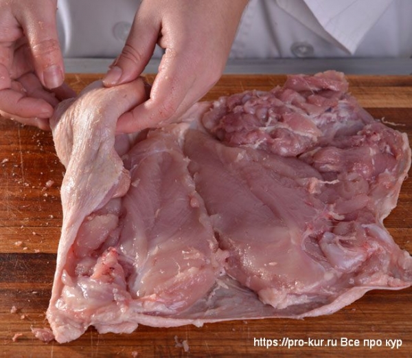 - Подрезаете мясо в местах, удерживающих скелет курицы. Грудину откладываете к позвоночнику;