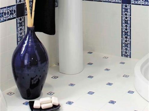 Нетрудно облицевать пол ванной и мозаичной керамикой. Мелкие кусочки керамики наклеены на основу — это карты ковровой мозаики. Процесс укладки отличается тем, что вдоль стен устанавливаются временные маячные ряды из сплошной керамики. Мозаика покрывается цементным раствором и кладётся основой вверх. Начинают работу от угла, проводят рядами. По мере формирования покрытия маячные плитки убираются, а их место занимает мозаика. Верхняя основа убирается после полного высыхания клеящей смеси. Для этого её увлажняют и снимают шпателем или скребком.