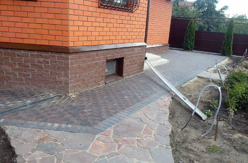 На гидроизоляционный материал, выстланный на утрамбованную поверхность, выкладывается либо сухая песчано-цементная смесь, либо бетон. Затем на это основание укладывается тротуарная плитка, клинкерный кирпич или брусчатка.