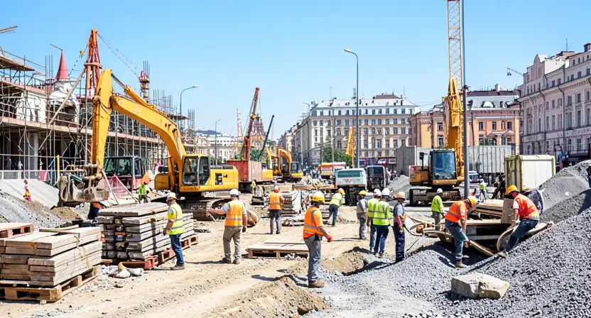 - Дорожные работы активно ведутся, включая укладку труб и асфальта.