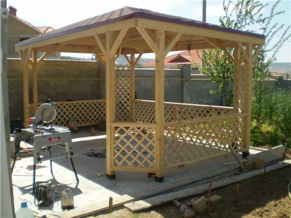 Это деревянная каркасная беседка без пола. Обратите внимание, что крыша четырехугольная, а сама беседка со скошенными углами
