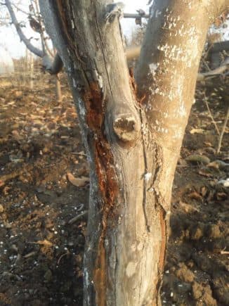 - Листья, кора, цветы вокруг поврежденного участка засыхают. Кора темнеет, покрывается язвами, начинается шелушение и отмирает. В запущенных случаях грибок (гриб) повреждает еще и древесину. На границах со здоровой корой появляются глубокие трещины и выделяется камедь.
