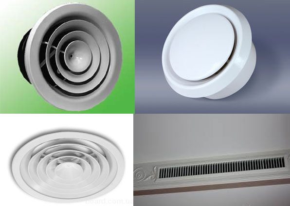 Чаще всего на потолке или на стене устанавливают вихревые диффузоры, представляющие собой декоративную панель прямоугольной или круглой формы, уплотненную по контуру специальной прокладкой. Если это приточная вентиляция, на ее обратной стороне есть воздухонаправляющее кольцо и крыльчатка, для вытяжной последней не предусмотрено.