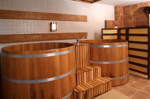 Подготовку кромок и пазов в форме «П» для дна лучше доверить специалистам столярной мастерской, а не экспериментировать с ручным фрезером. Затем конструкция соединяется металлическими обручами, которые опоясывают и одновременно прижимают доски. Для купели достаточно трех рядов обручей, которые можно стянуть гайками и болтами. После этого выполняется монтаж дополнительных функций: подогрев, системы фильтрации, джакузи, гидромассажа, аэратора. В завершение следует обустроить вход — закрепить несколько деревянных ступеней с перилами.