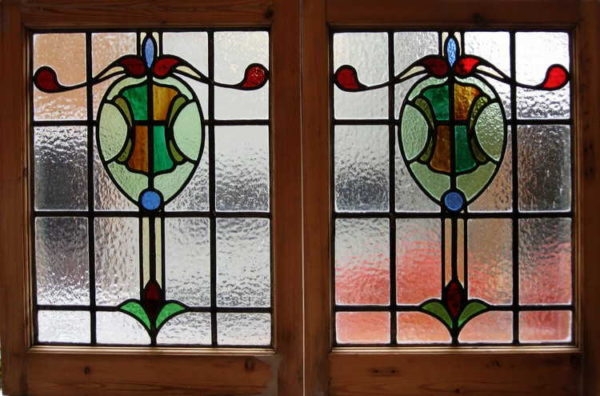 Витражные элементы в одном и том же стиле на дверях, окнах, в помещении