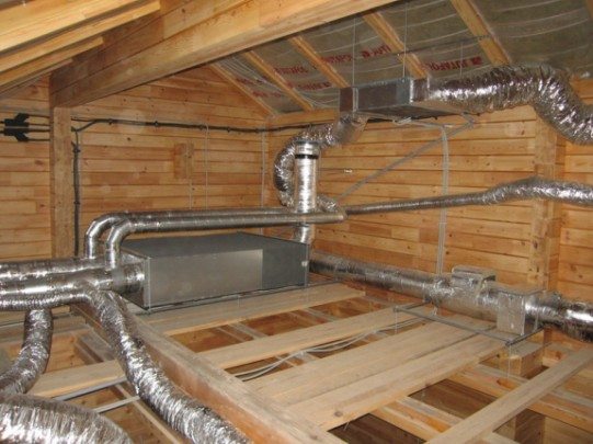 Любительское фото разветвленной вентиляционной системы установленной на чердаке здания для удобства произведения разводки