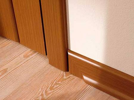 Это абсолютно привычный нам образ планки между полом и потолком с декоративным профилем под стандартный фрезерный деревянный рисунок. Такой плинтус изготавливается из поливинилхлорида и имеет самые высокие эксплуатационные характеристики, свойственные этому материалу.