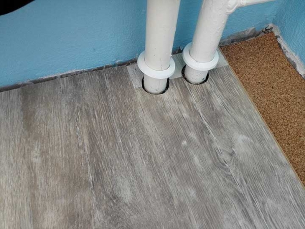 Иногда в процессе ремонта нет возможности спрятать коммуникации и в процессе укладки напольного покрытия возникают разного рода трудности. К примеру, после укладки ламината обязательно образуется зазор между напольным материалом и трубой, и как же быть в таком случае, как все замаскировать и сделать это красиво? Некоторые рекомендуют использовать герметик, это конечно закрывает зазор, но внешний вид далеко не самый лучший.