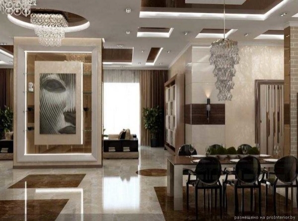 Потолки в современном дизайне не менее заметная часть интерьера, чем, скажем, стены. Они могут быть с любым количеством уровней, выполнены из гипсокартона, оштукатурены или скомбинированы с натяжными. В данной стилистике обычно присутствует люстра, но форму она имеет необычную, подходящую по стилю — из стекла или с металлизированной поверхностью. Плафоны — строгих форм без украшательств и завитушек.