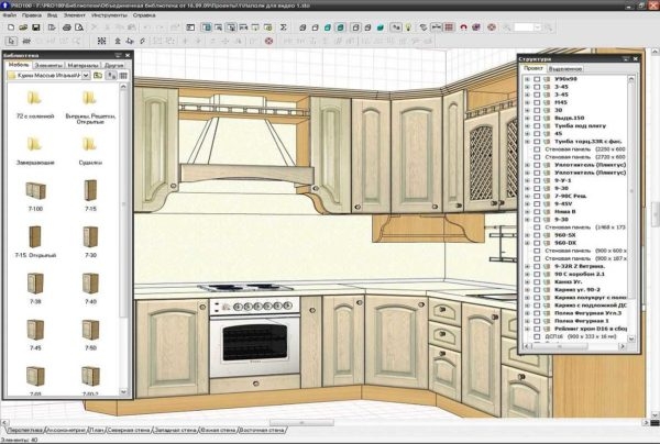 Подобрать мебель и материалы помогут уже готовые каталоги-библиотеки. Есть возможность создать каталог, загрузив собственные изображения и заполнив описания. Первый шаг проектирования — выбор типа кухни. При использовании стандартного каталога, выбираете в библиотеке название каталога, задаете цвет мебельных фасадов, филенок, тип стекла, фурнитуру и цвет корпуса. Эта библиотека подгружается в рабочую область и вы сможете из этого каталога выбирать элементы мебели. Причем они будут выглядеть так, как вы указали.