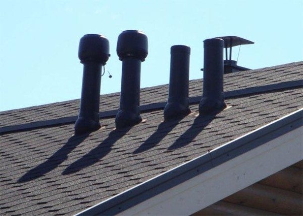 На фото – пример удачного размещения вентиляции, трубы проходят между планками обрешетки и не упираются в стропила