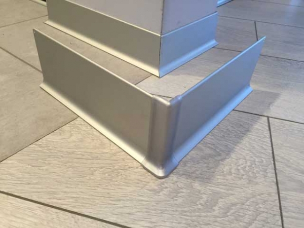 - Анодированный металлический плинтус представляет собой имитацию под благородные металлы, получаемую путём химической обработки (методом напыления) поверхностей соответствующими компонентами. Получившееся в результате этого покрытие выполняет чисто декоративную функцию и не оказывает влияния на прочностные характеристики изделия.