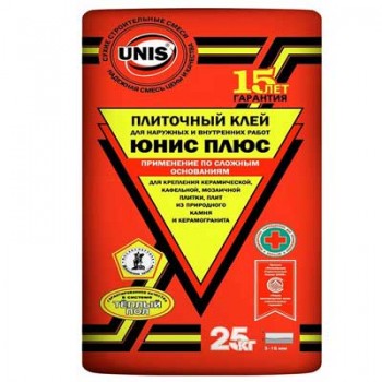 - Юнис используется для работ как на улице, так и внутри помещения. Клеевой раствор водостойкий, морозостойкий, обладает высокой сцепляемостью, имеет высокую эластичность. Самым прочным из линейки этих продуктов считается Юнис Плюс. Среди характеристик плиточного клея можно отметить адгезию в 1,25 Мпа и устойчивость к нагрузкам до 100 кг/кв. м.