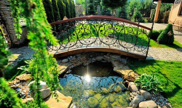 Это более изысканный вариант, для которого характерны четкие округлые линии и легкое изящное оформление. Мосты при этом преобладают с кованными элементами и орнаментами. Основание может быть как деревянное, так и бетонное, но важно органично сочетать материалы, чтобы не вызвать дисгармонии в стиле.