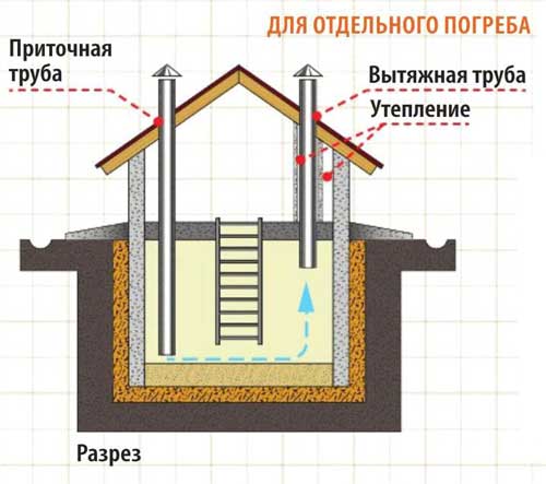 - если погреб находится в подвальном помещении, то можно обойтись и вовсе без приточной трубы, в таком случае воздух попадает в подвальное помещение через отверстия в цоколе. Но для большей эффективности все же рекомендуется установить приточную трубу, ее можно вывести наружу через цоколь;