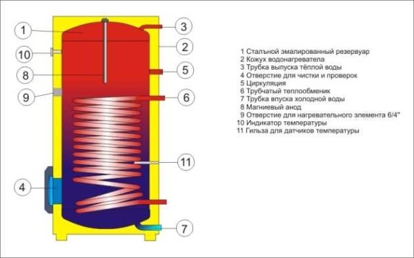 Водонагреватель или бойлер косвенного обмена — это бак с водой, в котором размещен теплообменник (змеевик или по типу водяной рубашки — цилиндр в цилиндре). Теплообменник подключен к котлу отопления или к любой другой системе, в которой циркулирует горячая вода или другой теплоноситель.
