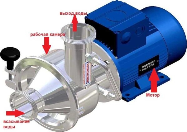 Основной рабочий элемент в данной конструкции — колесо с лопастями. Лопасти загнуты в обратном направлении по отношению к движению колеса. При движении они как-бы расталкивают воду, отжимая ее к стенкам корпуса. Такое явление называется центробежной силой, а зону между лопастями и стенкой называют «дифузор». Итак, рабочее колесо движется, создавая на периферии область повышенного давления и подталкивая воду в сторону выходного патрубка.