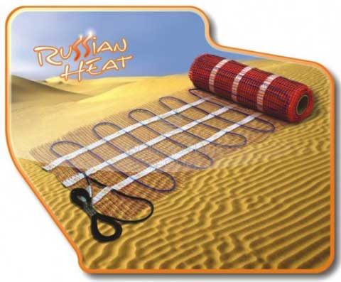 Это недорогая, но при этом достаточно качественная и безопасная система. Теплый пол Russian Heat, производимый в Малайзии, предназначен для установки под керамическую либо каменную плитку. В основе ее конструкции лежит термомат из двужильного кабеля, который равномерно распределяет тепло по поверхности. Его диаметр равен 3,6 мм (погрешность составляет плюм-минус 0,1. Он зафиксирован змейкой на полихлорвиниловой стеклосетке, ширина которой составляет 50 см, с постоянным шагом.