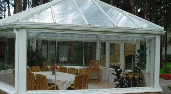 В последнее время все большую популярность приобретают постройки с поликарбонатом. Материал недорогой, эстетически привлекательный, обладает высокой пластичностью, что позволяет оформлять им нелинейные поверхности. На дачах или возле дома
